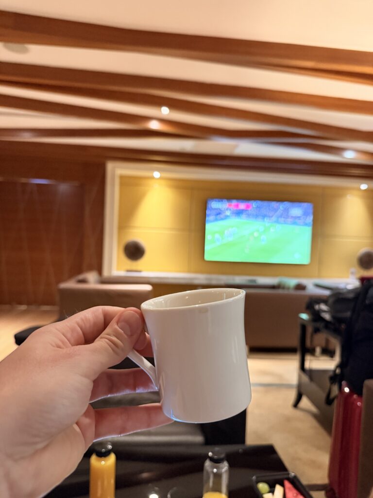 The SkySuite lounge was absolutely gorgeous, super luxury, big TVs, full bar, places you could sleep, actually, too. But for us, after the espresso martinis in the early start, it was coffees, fruit juice, and we used that lounge to organize our eSIMs and to plan our sightseeing itinerary for the day in Kuala Lumpur.