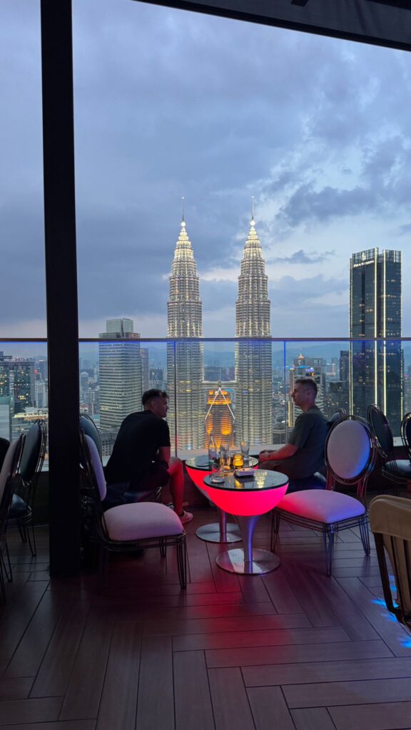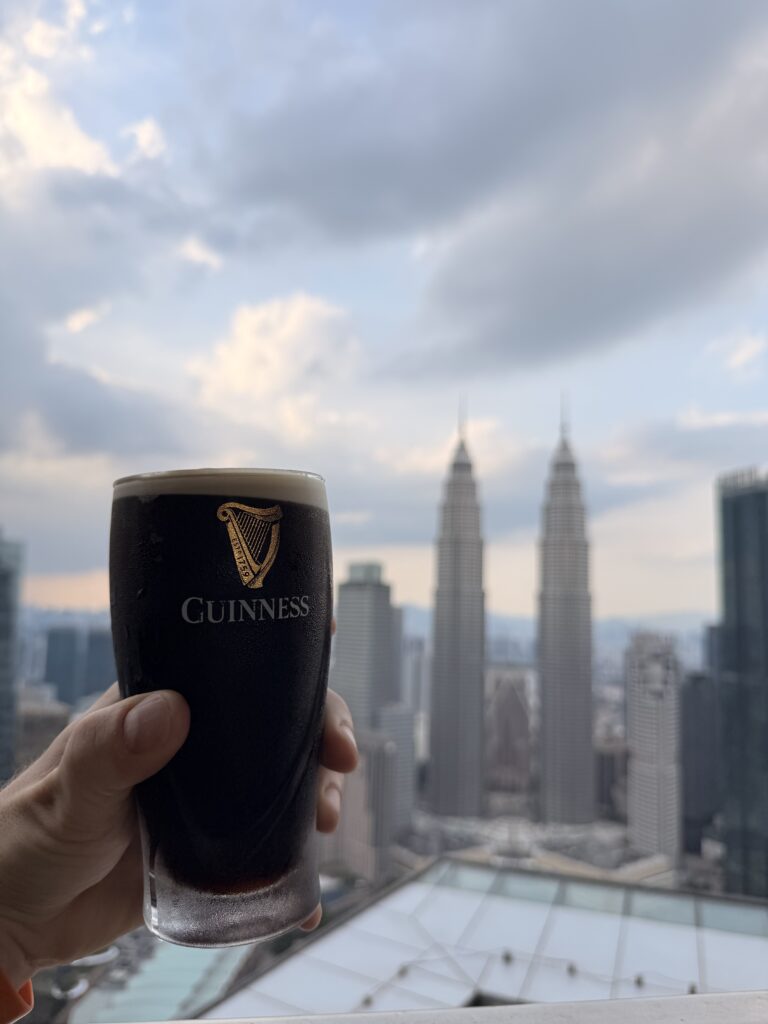 Then the secret plan after that, although my rules were no hotels and no restaurants, I did have a plan for a sunset cocktail overlooking the Twin Towers. Originally, I went to the W because it’s the best sky bar with views and it turned out it was a private function, so that was a wasted journey. Then we went to Martini’s and we were all wearing shorts, so we got rejected. And in the end, we went to the Lexus suite and they let us in. And it must have been fate because Guinness was on happy hour. So I bought a couple of rounds of Guinness for the boys and we watched the sunset on the majestic Twin Towers. And that was our sightseeing in Kuala Lumpur done. Epic day.