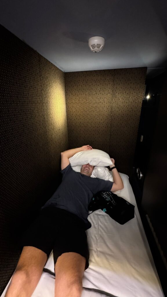 From there then we headed down to the landside Capsule Hotel. That’s on a first-come, first-served basis, but it’s huge, so we had no problem getting all three of us checked in there. We got our three hours booked that the Priority Pass allows, but we set our alarms to leave earlier than that so we could wake up from that Capsule Hotel, go through immigration and security in anticipation of our flight from Kuala Lumpur to Singapore, but then also, there’s another Capsule Hotel airside after security and immigration where we had another three hours in another Capsule Hotel booked. And once we checked in there, we got another full three-hour sleep in that Capsule Hotel. Perfect plan.