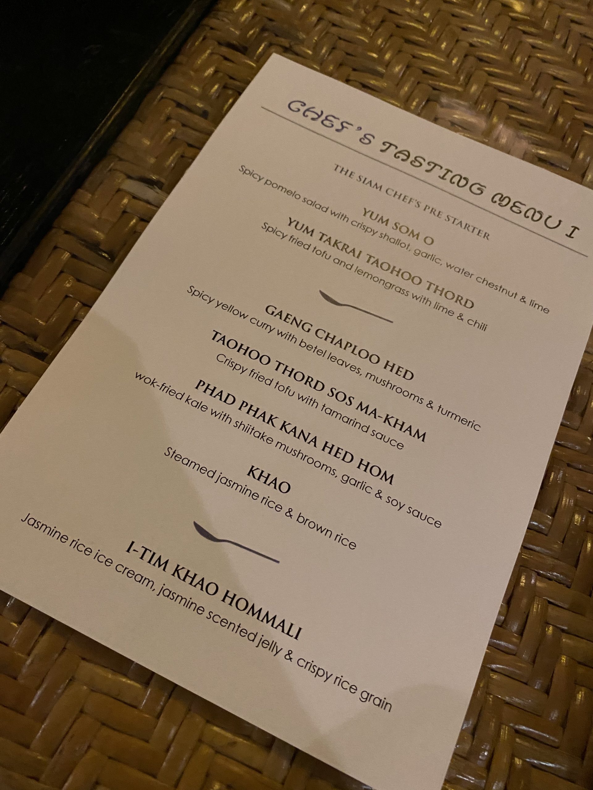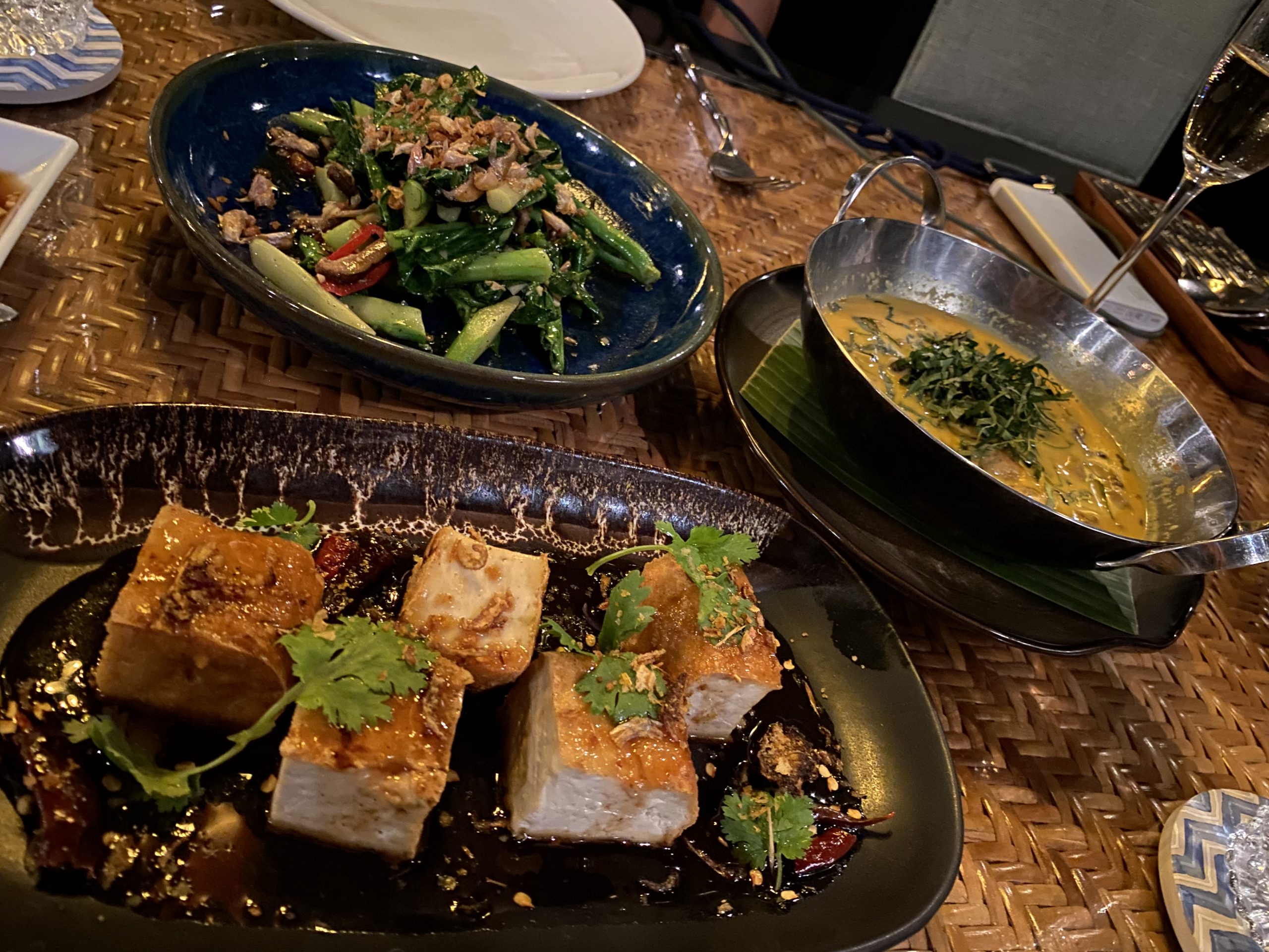 So Netflix by the bath and a bottle of red wine, this day was working out nicely. We had dinner reservations at Chon at 7pm. We got ready, headed to the Siam Pier for another cocktail and made our way to Chon Thai. The Thai-style building has been imported from Ayutthaya. It was dismantled from Jim Thompson’s old house, and reconstructed here. It is simply breathtaking. We had explained to the chef we were vegetarian and he put together the most delicious, subtle Thai tasting menu for us.