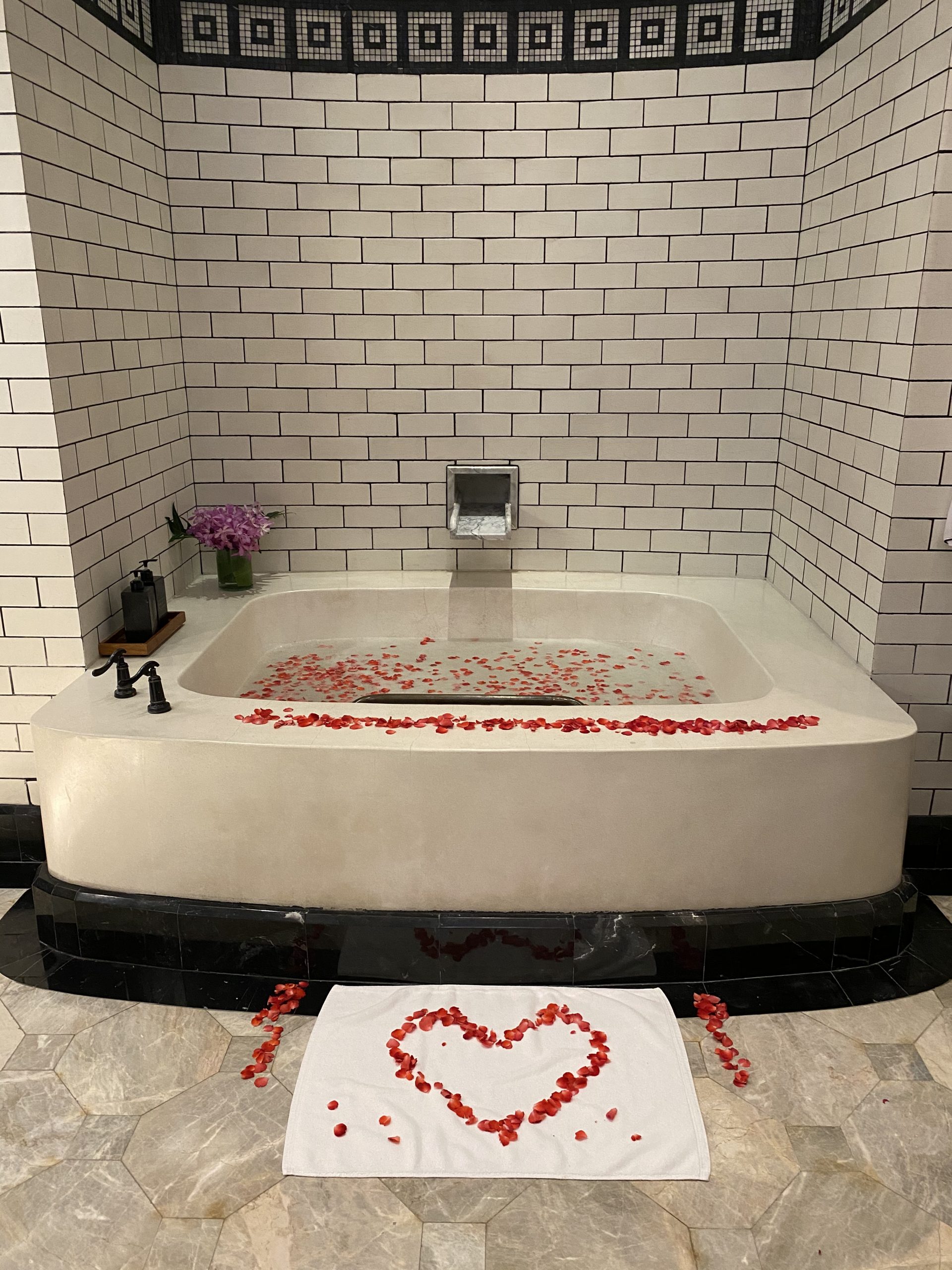 For us, we were celebrating a special occasion. By the time we got back to the room, our butler had prepared our bath. I had been moaning about my aching muscles from all the kilometres I was running for my ultra, that they had organised something a bit special for us. It was beautiful, check it out below.