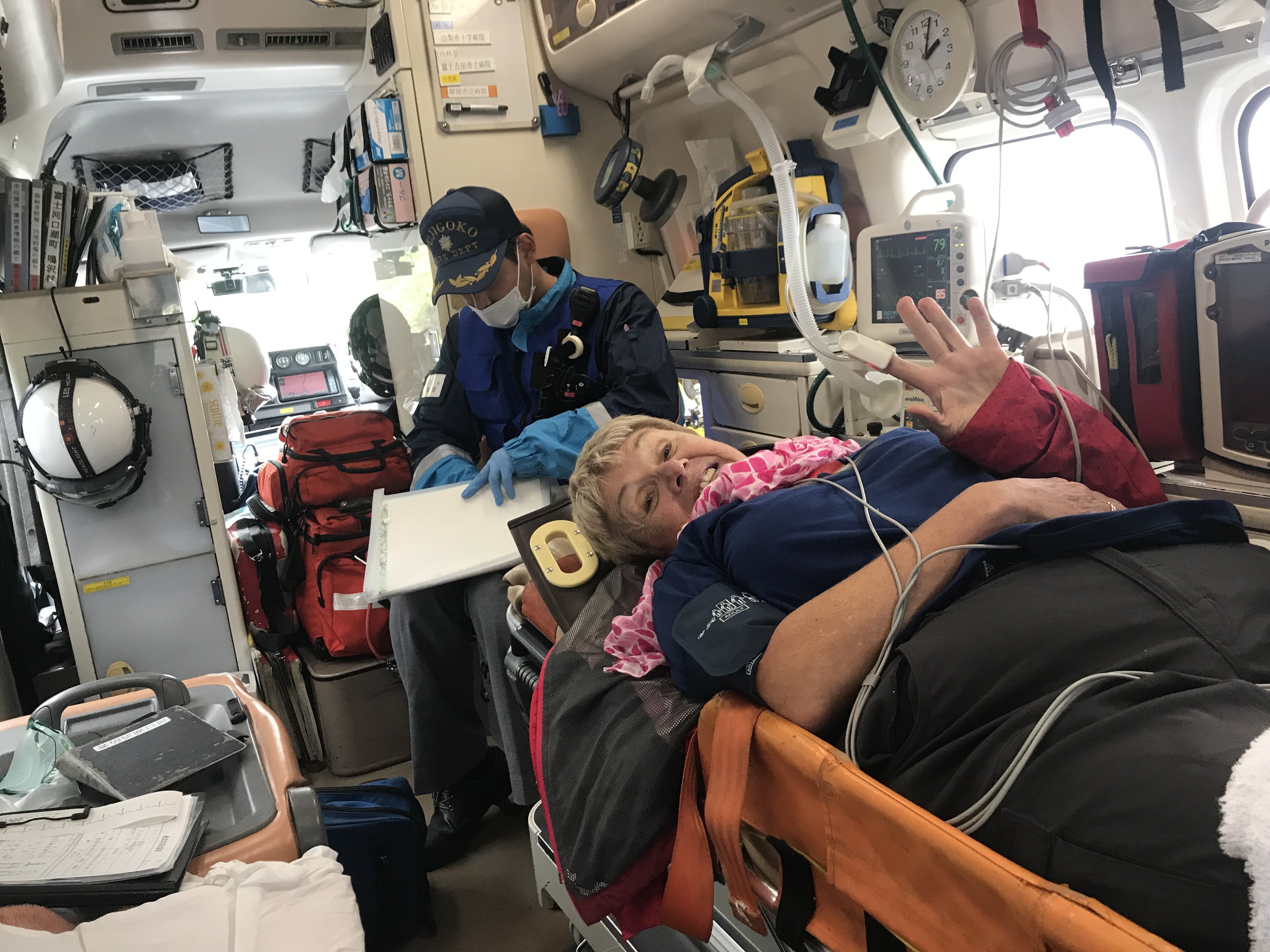 Ok, this is serious. I need to call for help. Check my phone. No signal. Like a movie. So there we were, on the side of Mount Fuji, no visibility, no-one around us, no phone signal and my mum couldn’t stand or speak, she could barely breathe. What were we to do?! Out of the fog, a Japanese man appeared. I called him over, despite the language barrier, it was quite obvious we were in distress. Fast forward 1 hour, and we are in an agricultural vehicle, taking us down the mountain. My mum lying down, barely able to sit up. But as we descended, and the air was more oxygenated, and she came back around a little and could talk coherently again. Wow, that was scary.