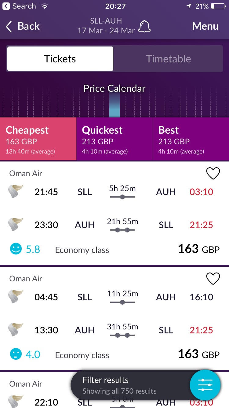 - Cheapest/Quickest/Best. On the seach results (screenshot above) you can instantly search for the most appropriate option for you. For me, I used to automatically click on ‘cheapest’ and no matter how uncomfortable the connections were, long layovers etc, I’d always use the cheapest! My sister‘s nature would always be to choose the quickest (often the most expensive!), which is understandable when traveling with toddlers. Now, my online businesses are doing ok, I go to the ‘Best’ tab and choose that – it’s more of a compromise between ridiculously expensive and ridiculously direct, giving you a solid choice – not the cheapest, but also not travel torture.