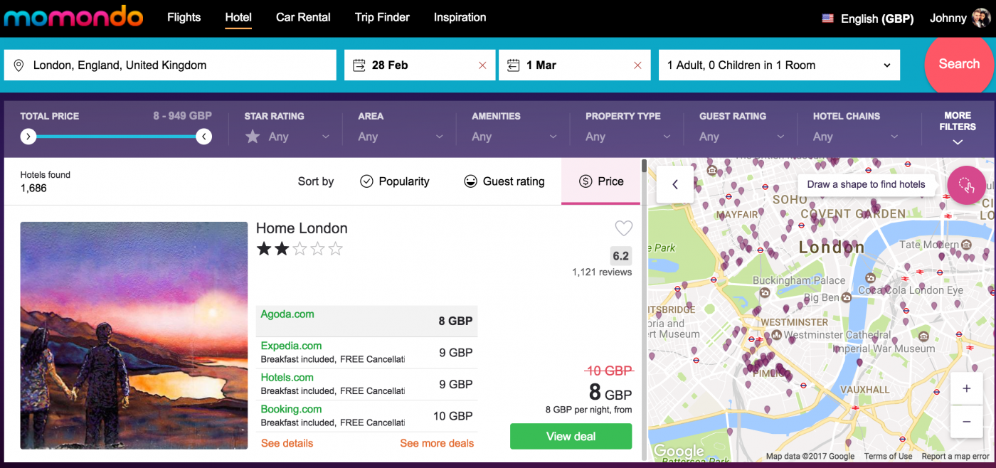 The hotels thing is great though. It has the same model as the flights comparison so you choose your dates, your city etc, then use all your filters then hit search. From here, momondo uses other engines like hotels.com, expedia etc, searching all the cheapest prices, then you simply choose the cheapest one, perfect! This kind of thing makes you stop ever using the traditional hotel search engines, because it aggregates them all.