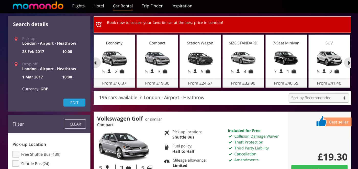 As momondo gets bigger and more popular, they’ve added loads more features with both car rental and hotel searches available. I rarely rent cars so have personally never used it, but having browsed it a lot it seems equally as user friendly as every other function on momondo.