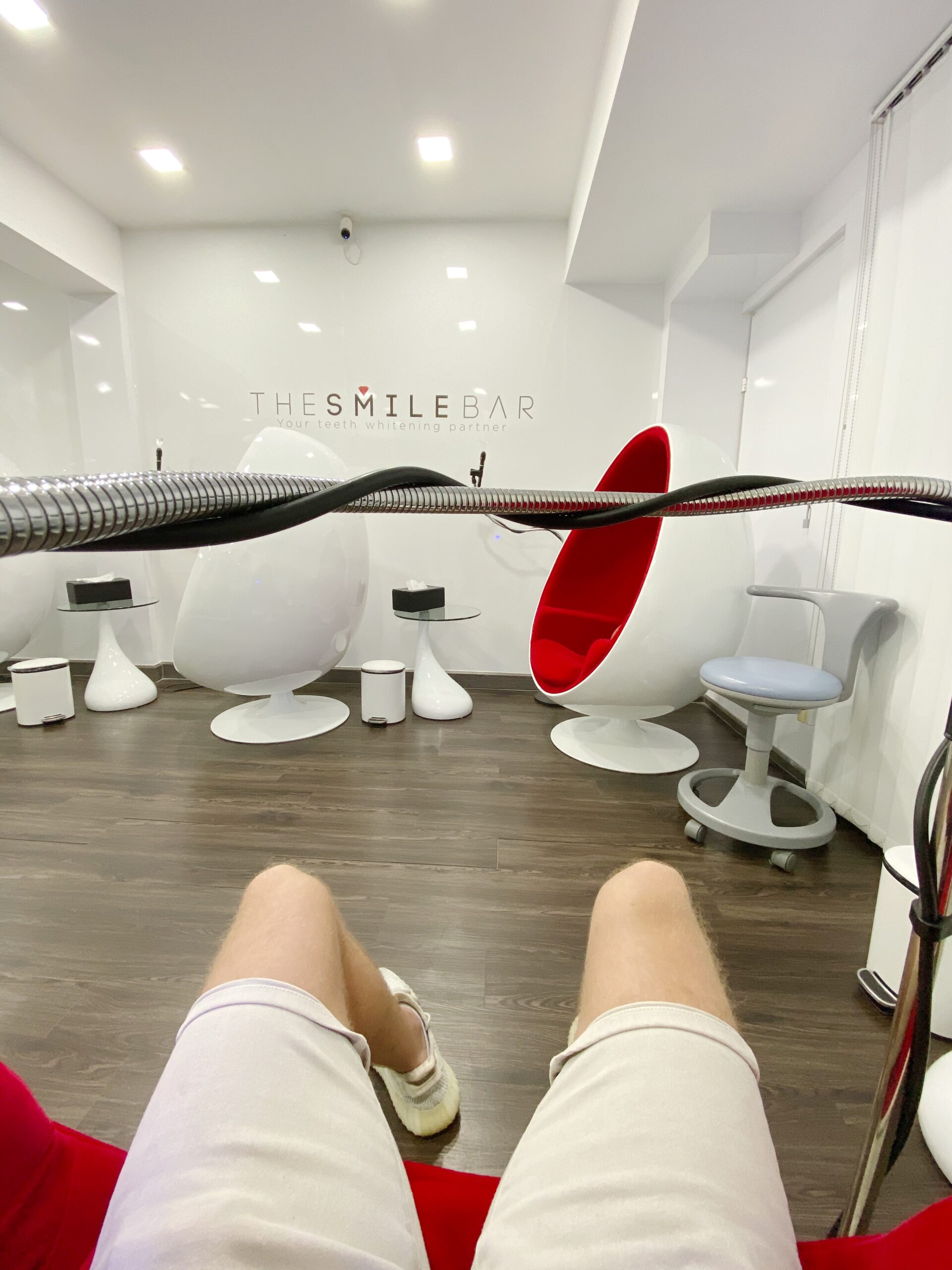 After the consultation, you’re taken to a dentist area where you brush your teeth quickly. Then finally you enter the teeth-whitening room. It’s like a luxury, modern airport lounge. Big comfortable chairs. Futuristic technology propped-up beside each one. You sit down, and a qualified dentist comes and talks you through the process.