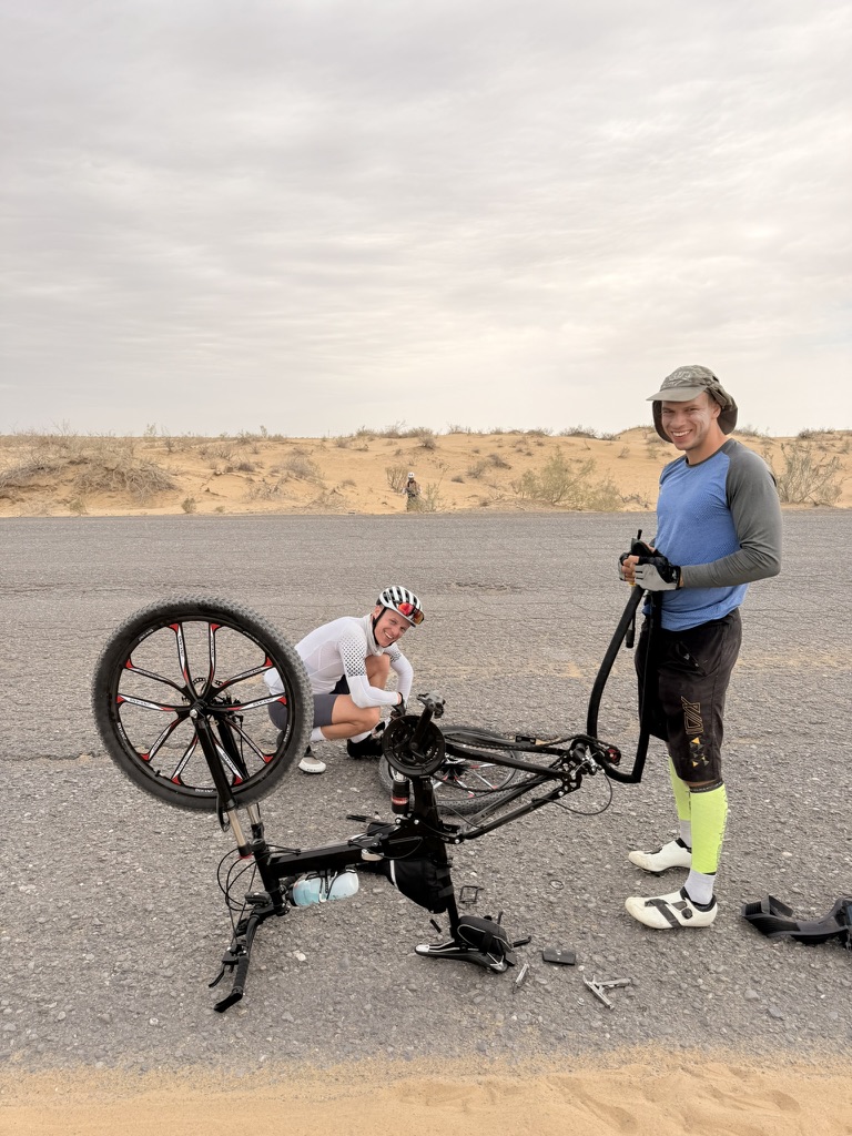 At 5am, we rolled out of Ashgabat in the dark. Day 1 started smooth. Perfect roads, empty streets, the city glowing gold behind us. For the first 20km, we rode as one group, like a peloton. Then, less than one kilometre in, a bike snapped.